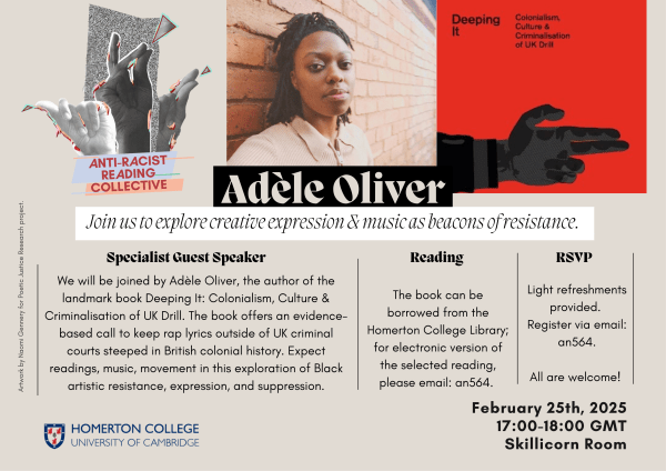 Join Adèle Oliver and the Homerton Anti-Racist Reading Collective to explore creative expression & music as beacons of resistance.