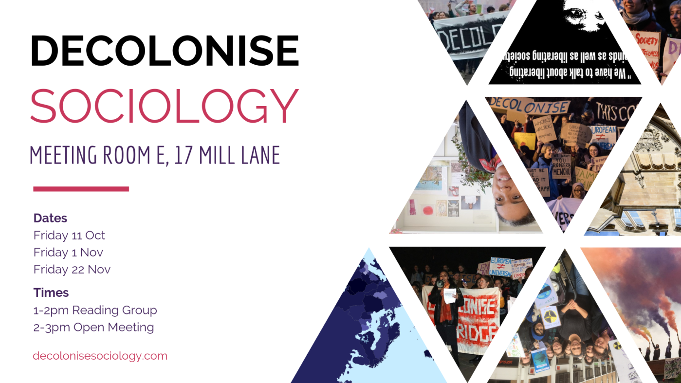 Join us for the third session of the Decolonise Sociology Committee on Friday 22 November @ 1pm in Room E (17 Mill Lane)