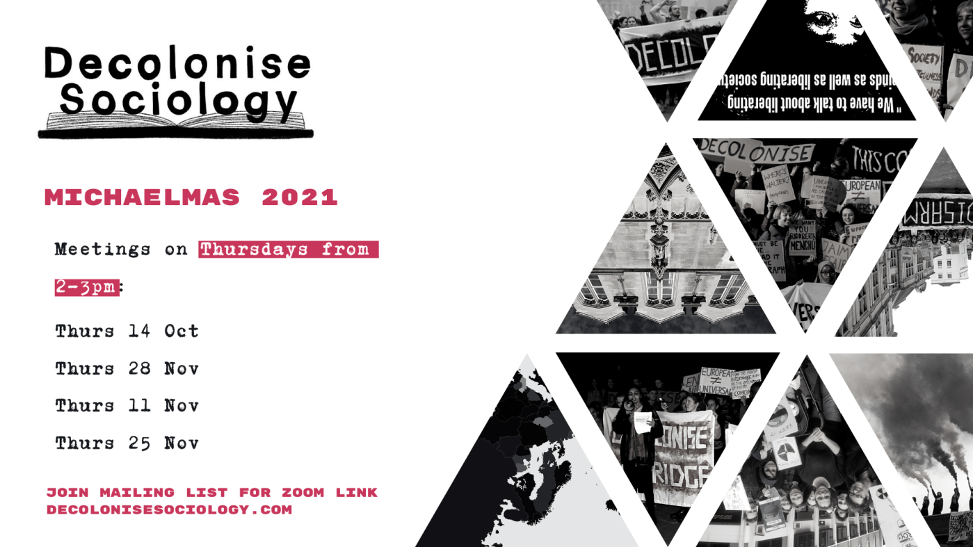 The committee is chaired this year by Dr Ali Meghji. Meetings in Michaelmas term will take place at the times below via Zoom. These meetings are open to all and we particularly encourage new sociology students to attend. Join our mailing list to receive the zoom links for each session.